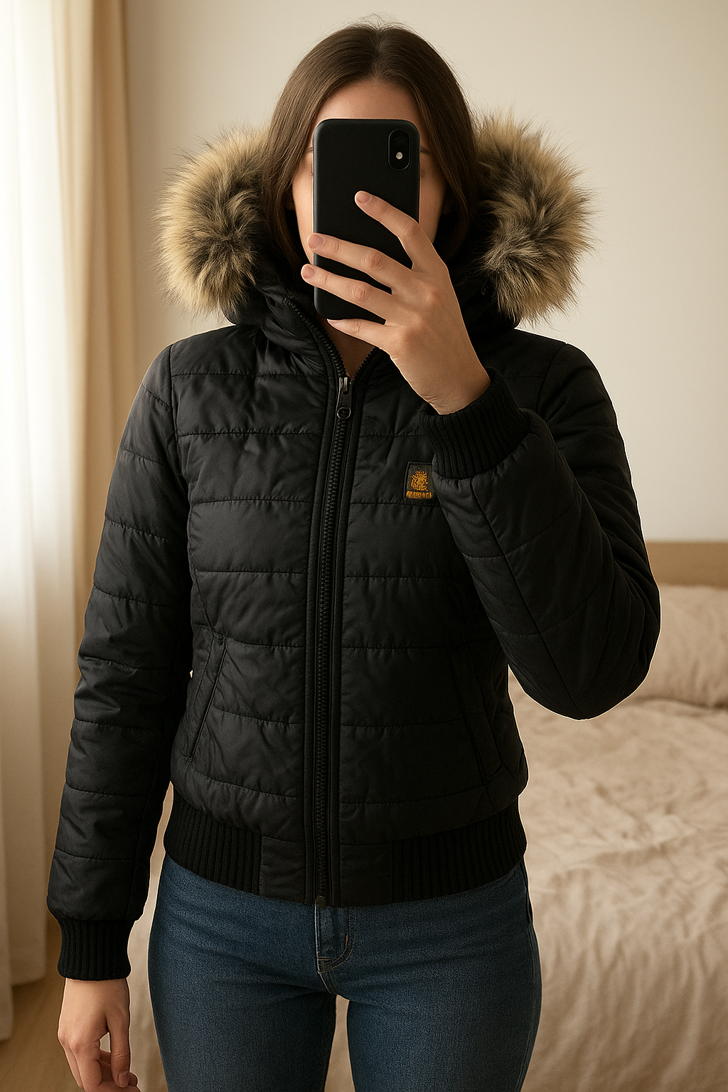 Piumino Refrigiwear Sixty Nero in piedi, rivolto verso la fotocamera, in una camera da letto con luce soffusa e luce naturale che filtra dalla finestra.