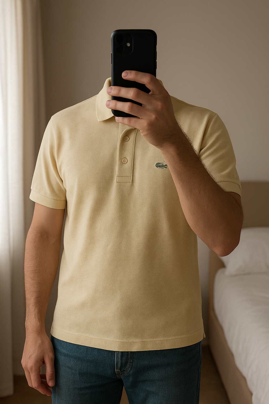 Polo Lacoste Amarelo Claro - Tamanho M (42) em pé, de frente para a câmera, em um quarto com iluminação suave e luz natural filtrando pela janela.
