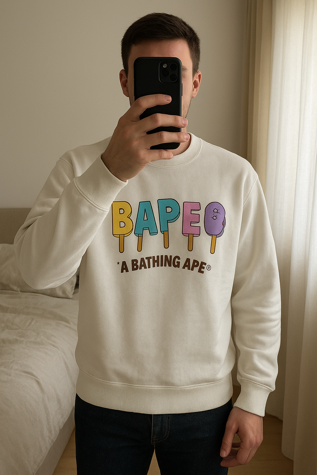 Pull BAPE Blanc neuf sans étiquette debout, face à la caméra, dans une chambre à la lumière douce, avec une lumière naturelle filtrant par la fenêtre.