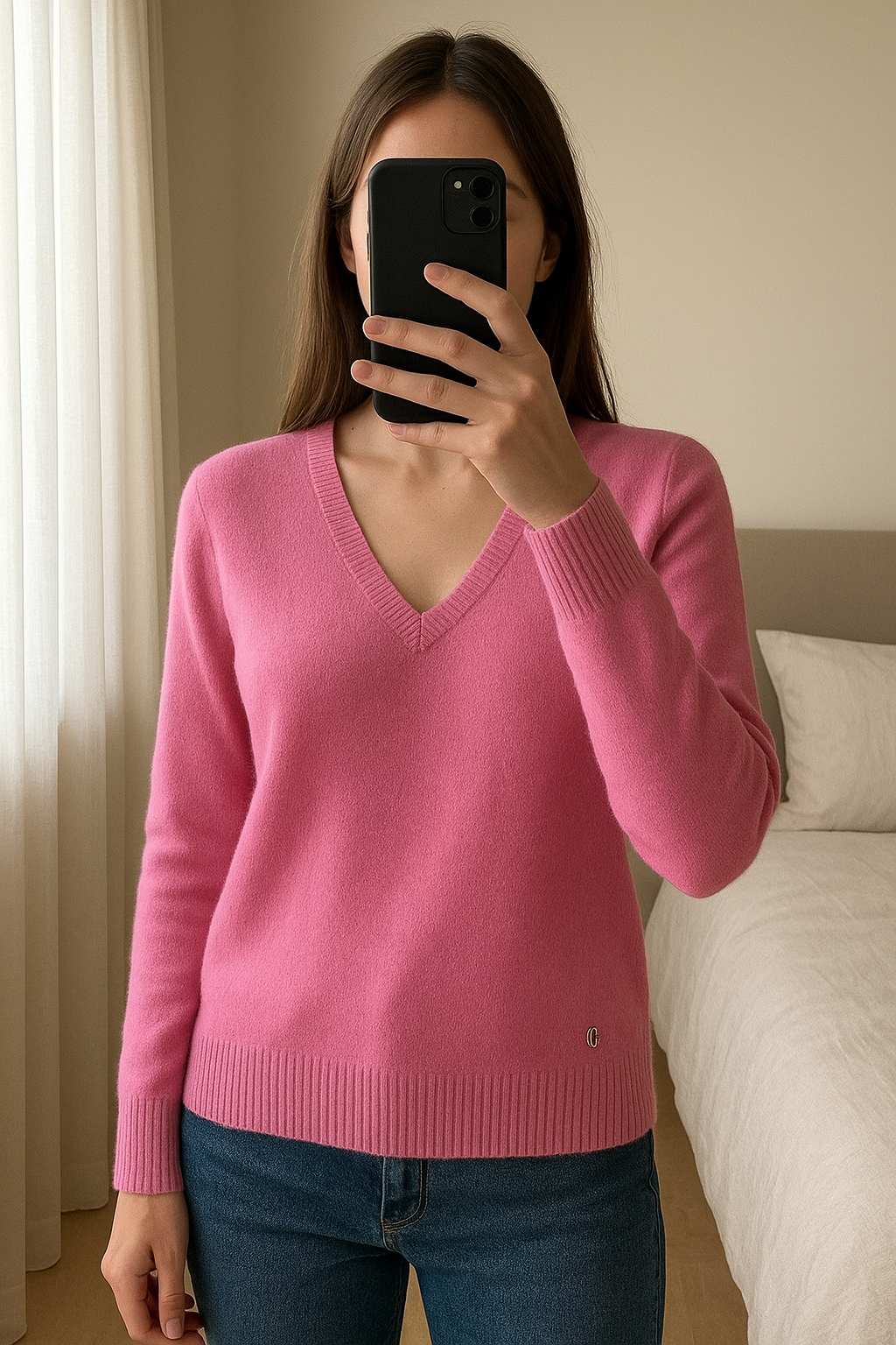 Pull cachemire debout, face à la caméra, dans une chambre à la lumière douce, avec une lumière naturelle filtrant par la fenêtre.