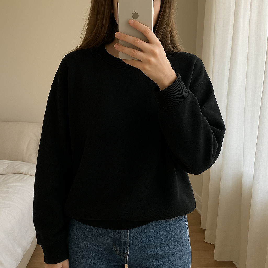 Pull col rond Primark taille XL debout, face à la caméra, dans une chambre à la lumière douce, avec une lumière naturelle filtrant par la fenêtre.