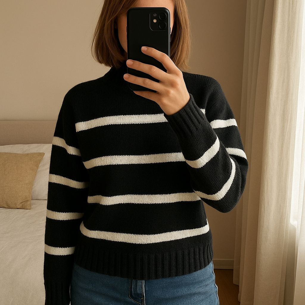 Pull col roulé debout, face à la caméra, dans une chambre à la lumière douce, avec une lumière naturelle filtrant par la fenêtre.
