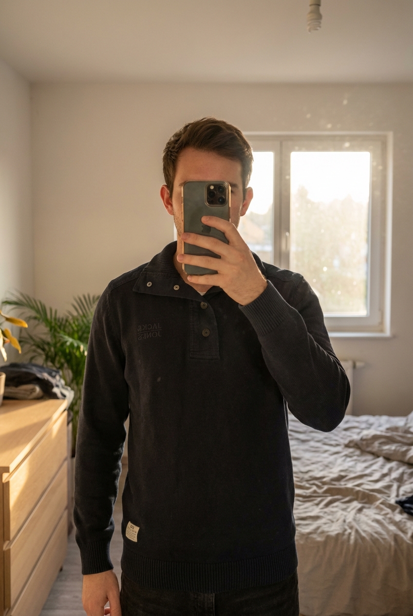 Pull jack jones debout, face à la caméra, dans une chambre à la lumière douce, avec une lumière naturelle filtrant par la fenêtre.