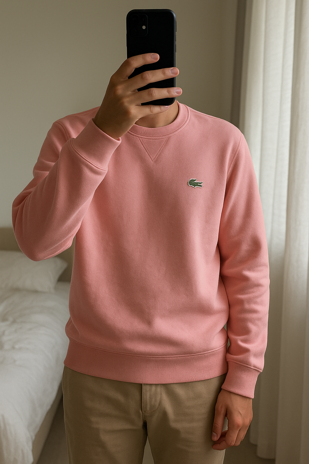 Pull Lacoste debout, face à la caméra, dans une chambre à la lumière douce, avec une lumière naturelle filtrant par la fenêtre.