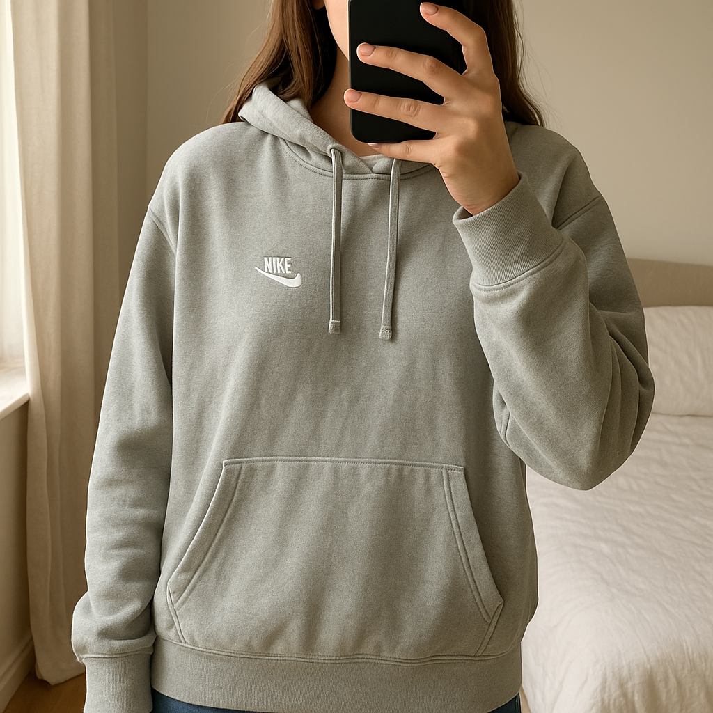 Pull Nike à capuche taille L debout, face à la caméra, dans une chambre à la lumière douce, avec une lumière naturelle filtrant par la fenêtre.