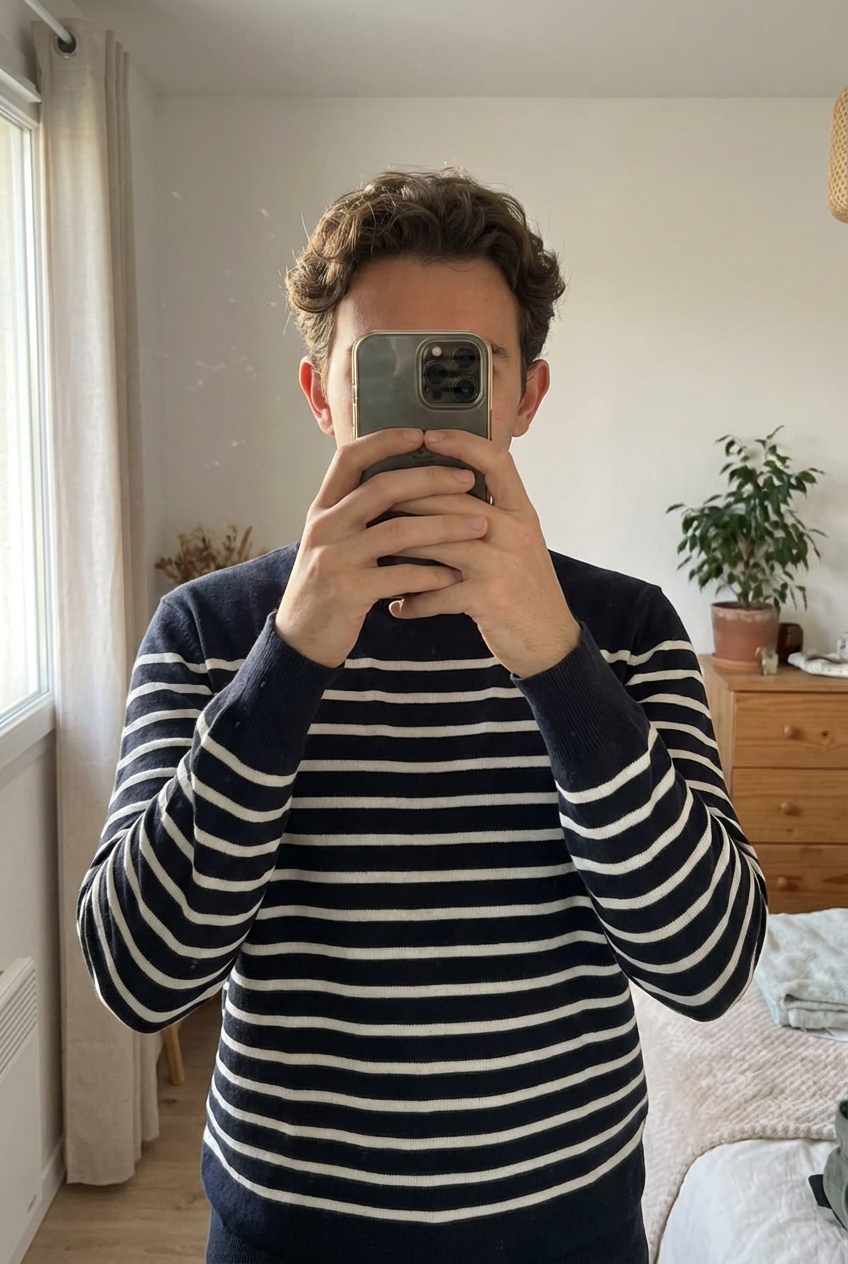 Une personne en Pull rayé debout, face à la caméra, dans une chambre à la lumière douce, avec une lumière naturelle filtrant par la fenêtre.