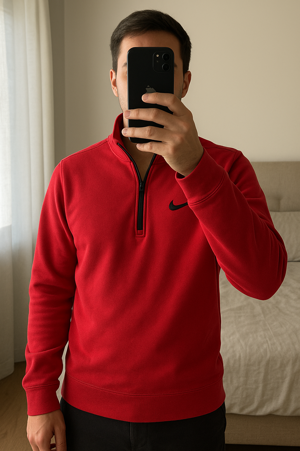 Pull Rouge Nike à col Homme debout, face à la caméra, dans une chambre à la lumière douce, avec une lumière naturelle filtrant par la fenêtre.
