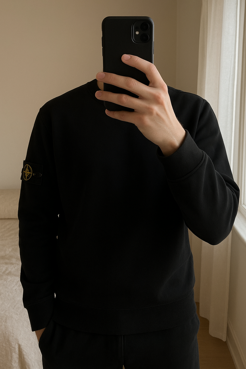Pull stone debout, face à la caméra, dans une chambre à la lumière douce, avec une lumière naturelle filtrant par la fenêtre.