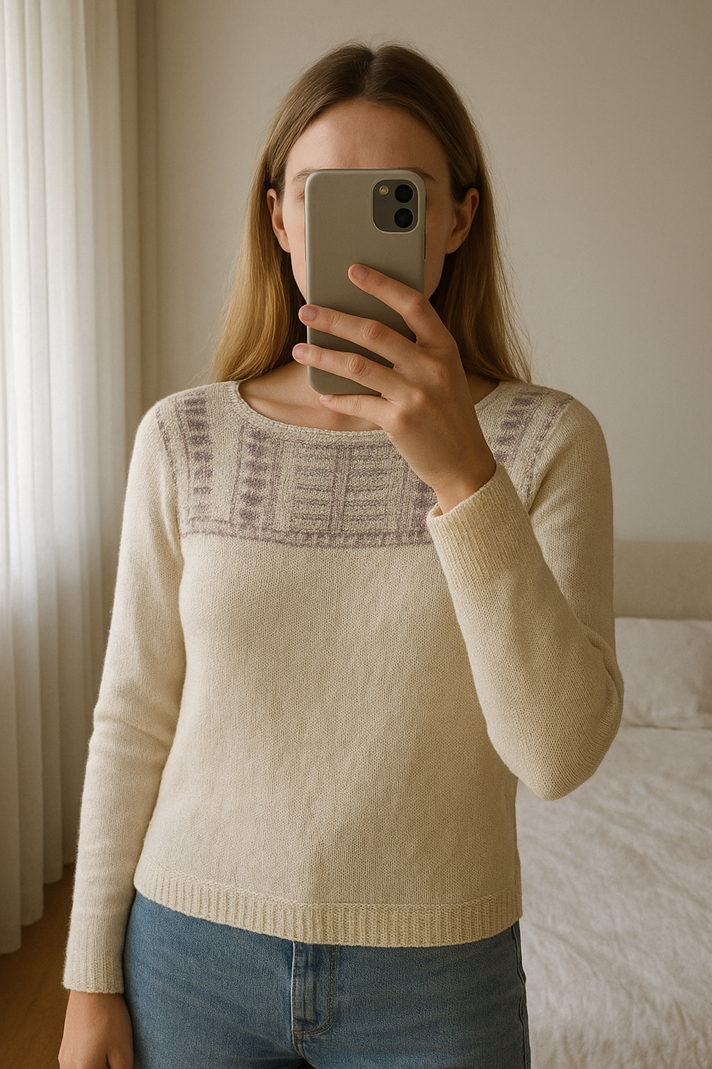 Pull Sweet Roxy – Taille S debout, face à la caméra, dans une chambre à la lumière douce, avec une lumière naturelle filtrant par la fenêtre.