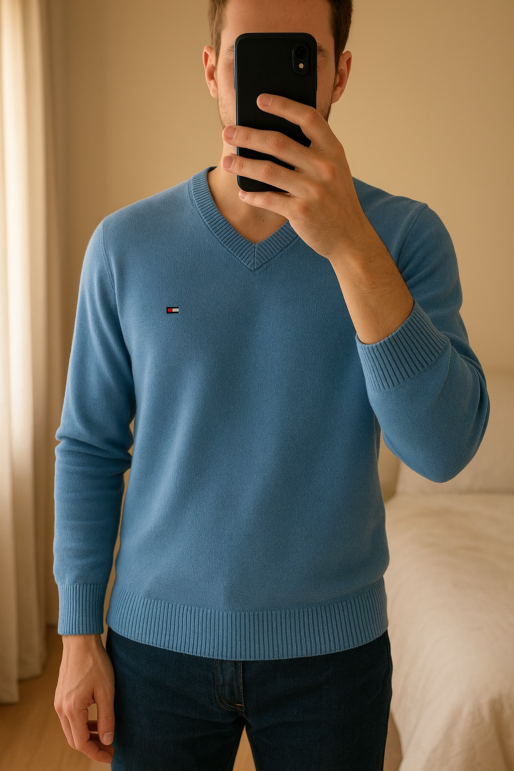 Pull Tommy Hilfiger debout, face à la caméra, dans une chambre à la lumière douce, avec une lumière naturelle filtrant par la fenêtre.