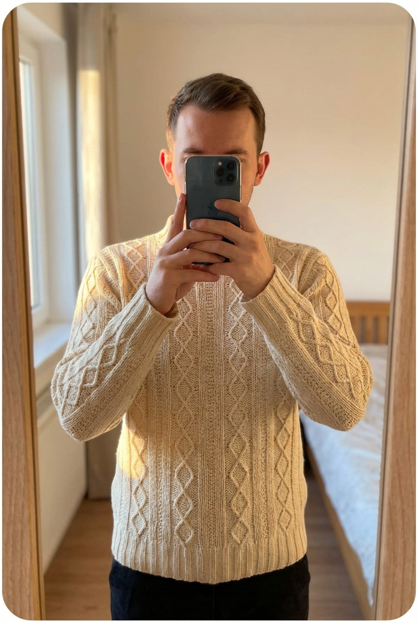 Pull Torsadé Aran Wool Sweater Blanc Créme XXL debout, face à la caméra, dans une chambre à la lumière douce, avec une lumière naturelle filtrant par la fenêtre.