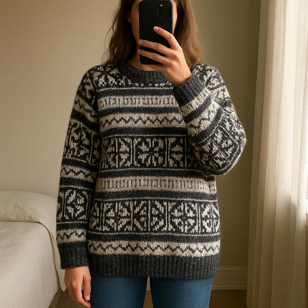Pull vintage à motifs nordiques - Peter England debout, face à la caméra, dans une chambre à la lumière douce, avec une lumière naturelle filtrant par la fenêtre.
