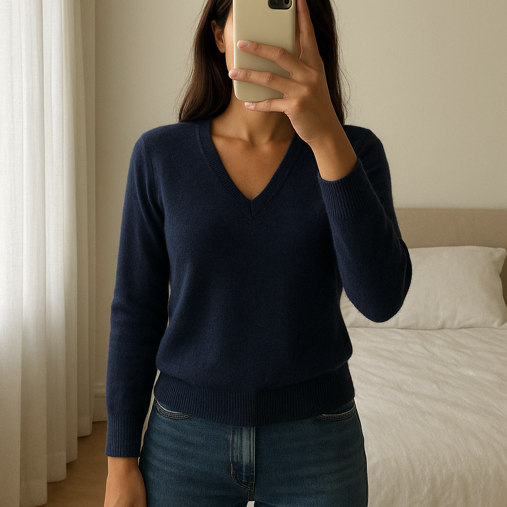Une personne en Pull Yessica 100% Cachemire debout, face à la caméra, dans une chambre à la lumière douce, avec une lumière naturelle filtrant par la fenêtre.