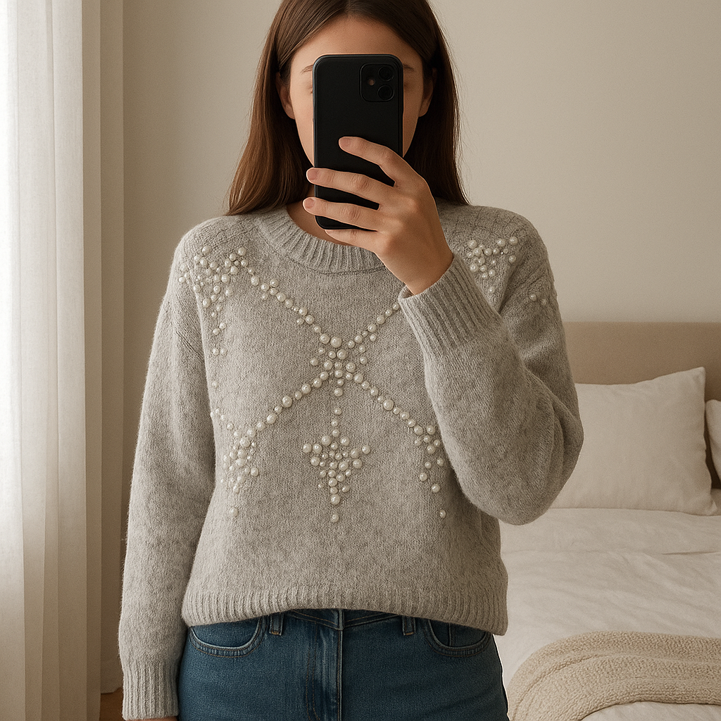 Pull Zara Perle T36 debout, face à la caméra, dans une chambre à la lumière douce, avec une lumière naturelle filtrant par la fenêtre.
