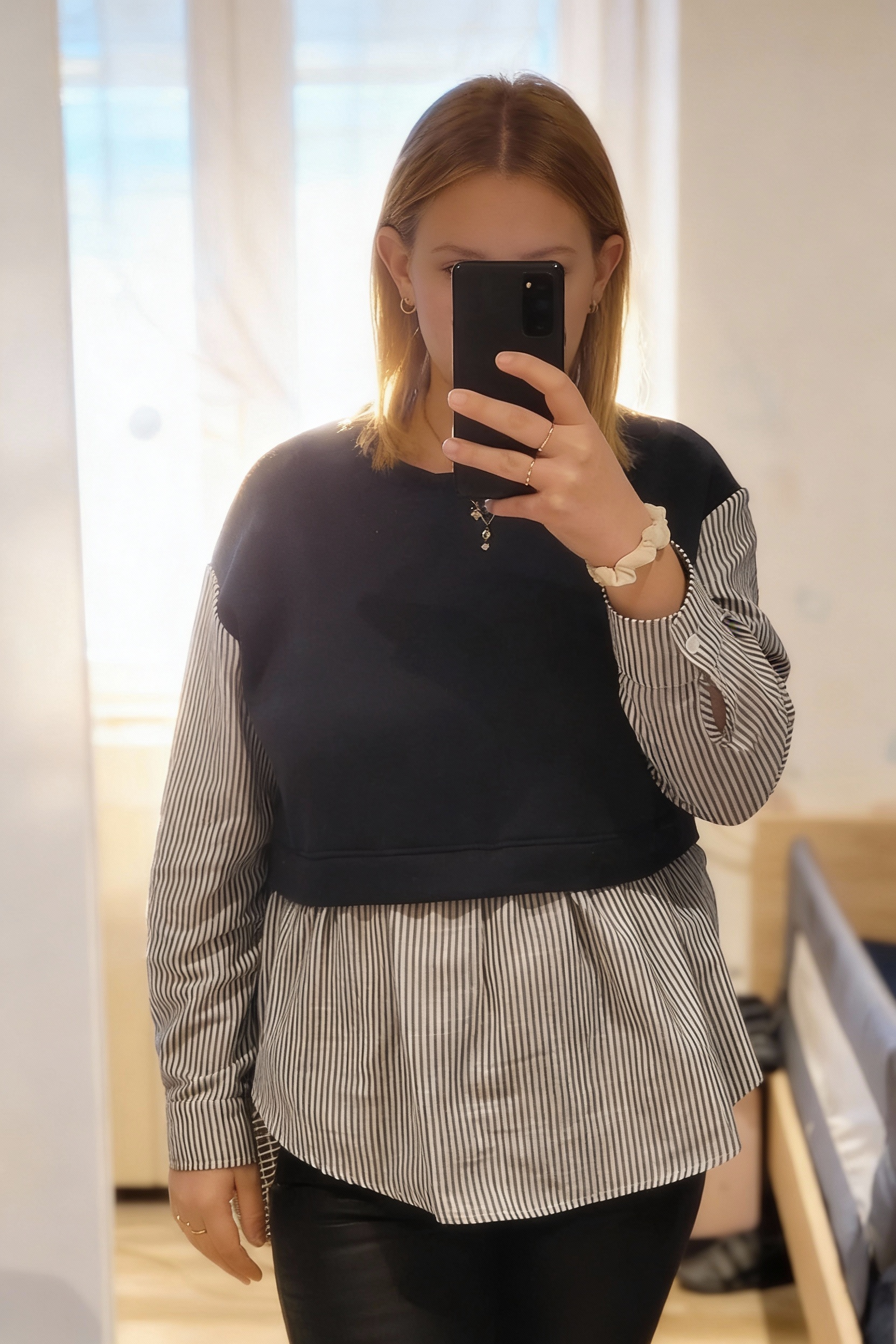 Pulls shein 40/42 debout, face à la caméra, dans une chambre à la lumière douce, avec une lumière naturelle filtrant par la fenêtre.