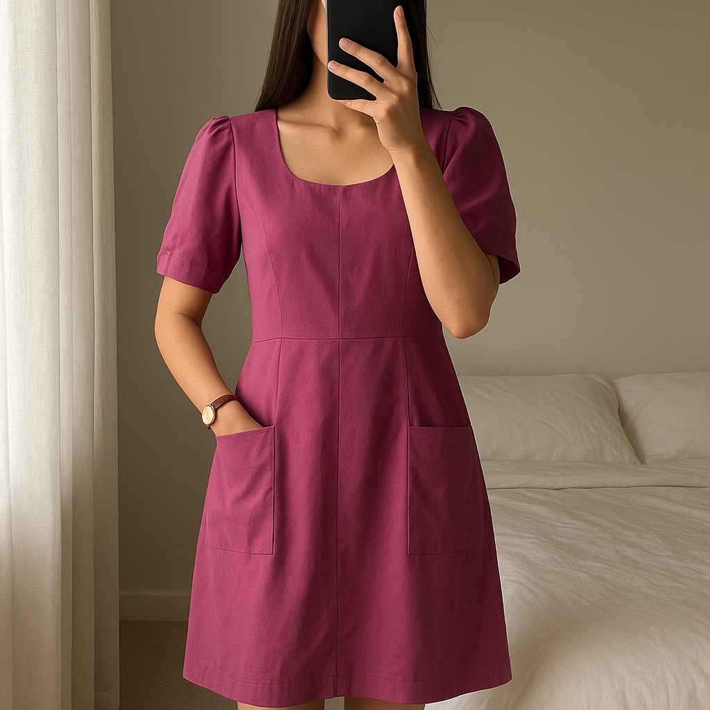 Robe Asos rose taille 40 debout, face à la caméra, dans une chambre à la lumière douce, avec une lumière naturelle filtrant par la fenêtre.
