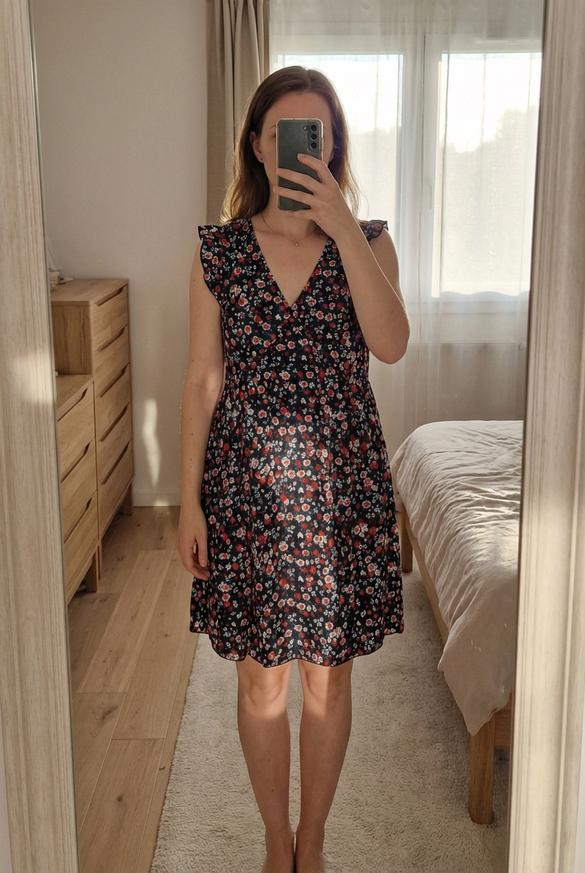 Une personne en Robe cache-cœur sans manche debout, face à la caméra, dans une chambre à la lumière douce, avec une lumière naturelle filtrant par la fenêtre.