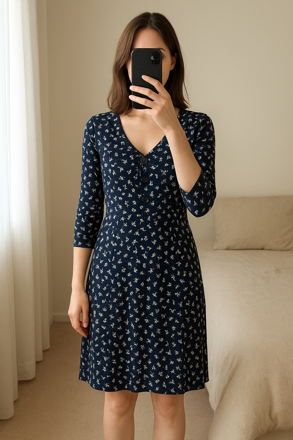 Robe camaïeu taille M style leopard bleu debout, face à la caméra, dans une chambre à la lumière douce, avec une lumière naturelle filtrant par la fenêtre.