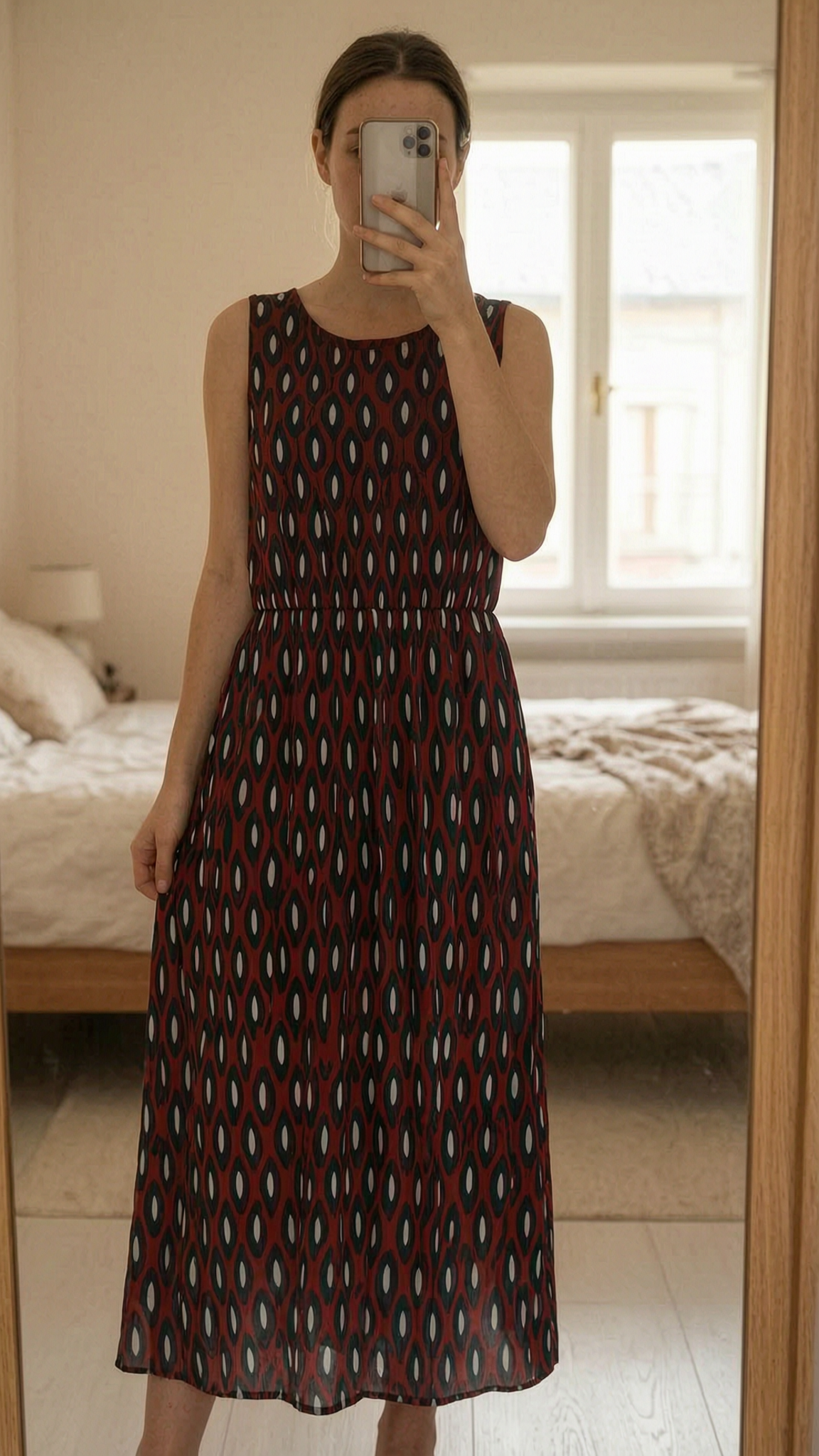 Robe d’été sans manche debout, face à la caméra, dans une chambre à la lumière douce, avec une lumière naturelle filtrant par la fenêtre.