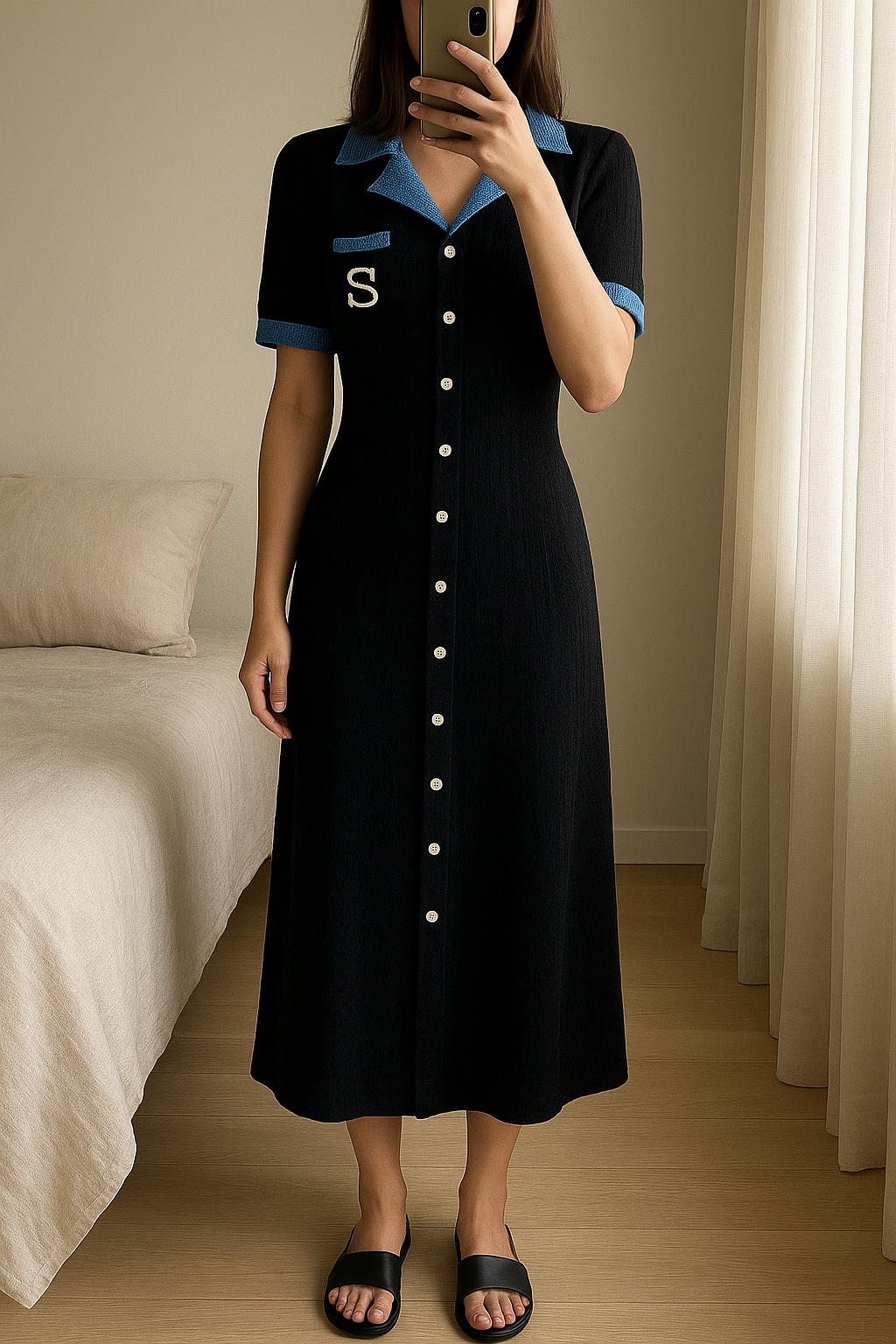 Robe en maille debout, face à la caméra, dans une chambre à la lumière douce, avec une lumière naturelle filtrant par la fenêtre.