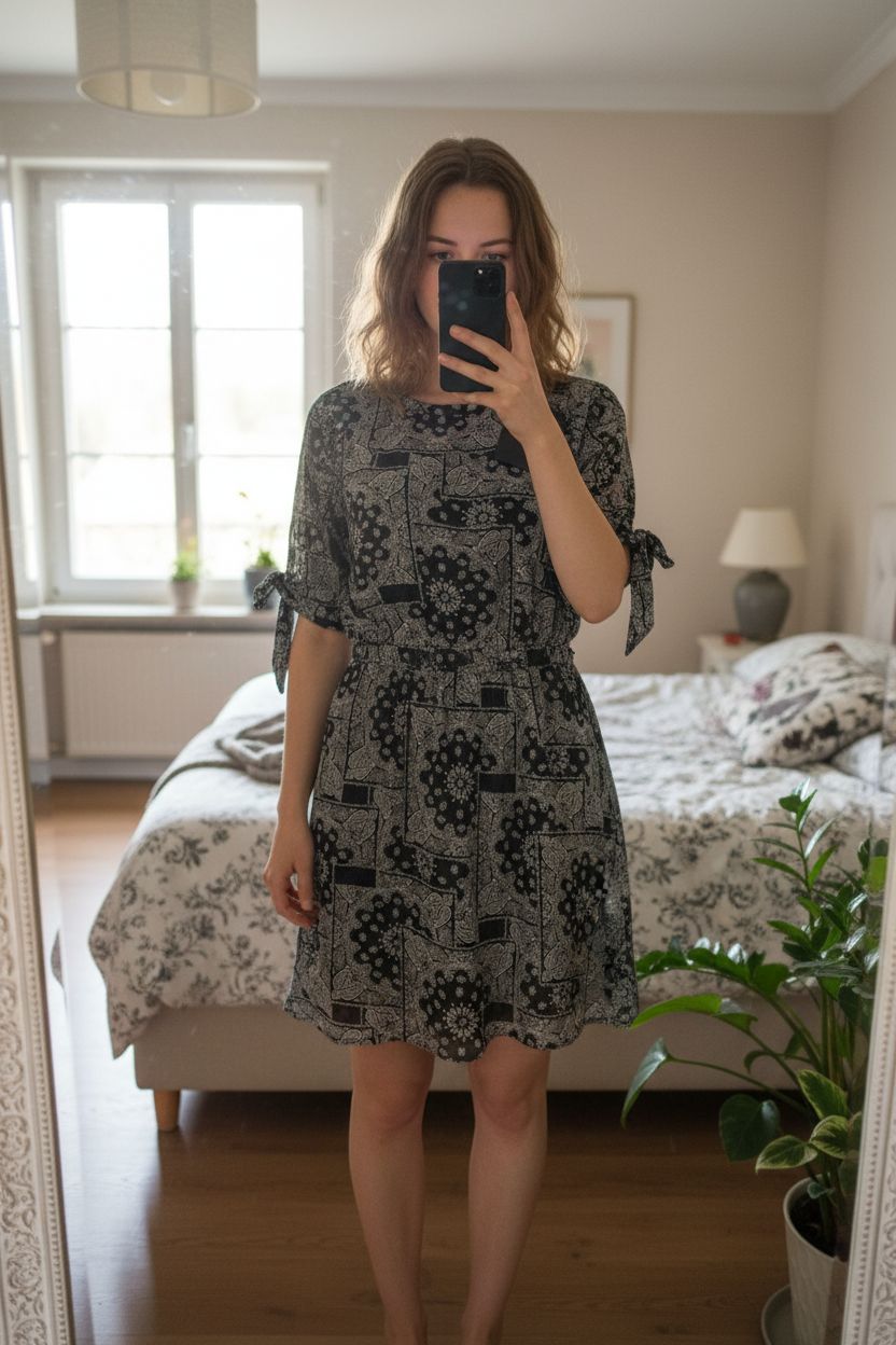 Robe femme The Kooples taille S/1 debout, face à la caméra, dans une chambre à la lumière douce, avec une lumière naturelle filtrant par la fenêtre.