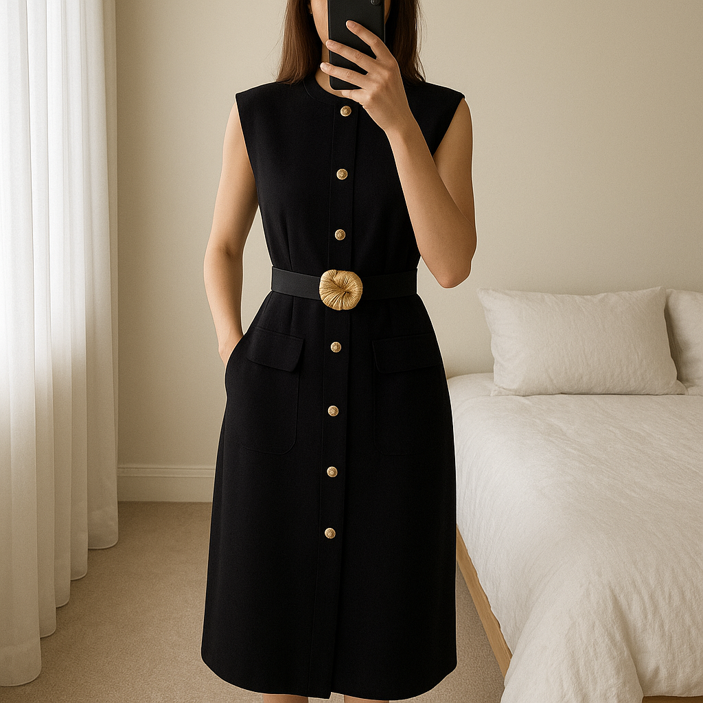 Robe longue Chic Zara Noir debout, face à la caméra, dans une chambre à la lumière douce, avec une lumière naturelle filtrant par la fenêtre.