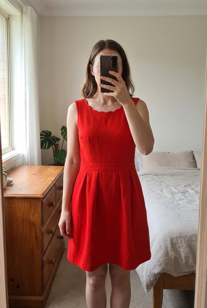 Robe rouge debout, face à la caméra, dans une chambre à la lumière douce, avec une lumière naturelle filtrant par la fenêtre.
