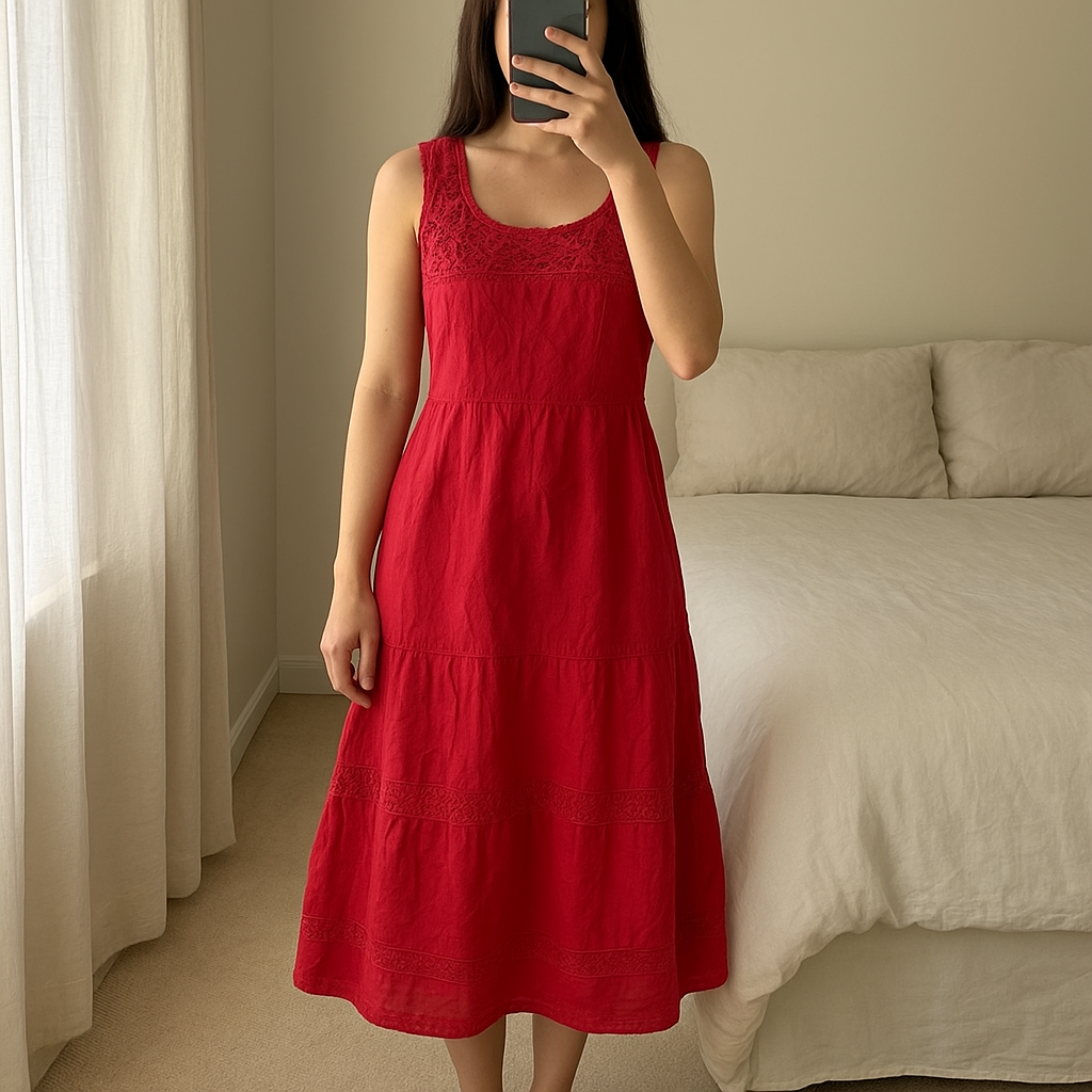 Robe tunique debout, face à la caméra, dans une chambre à la lumière douce, avec une lumière naturelle filtrant par la fenêtre.