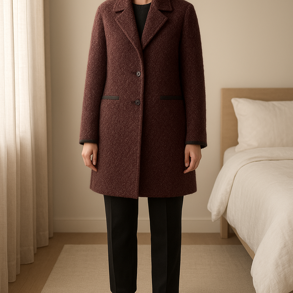 Sobretudo da Cortefiel em pé, de frente para a câmera, em um quarto com iluminação suave e luz natural filtrando pela janela.