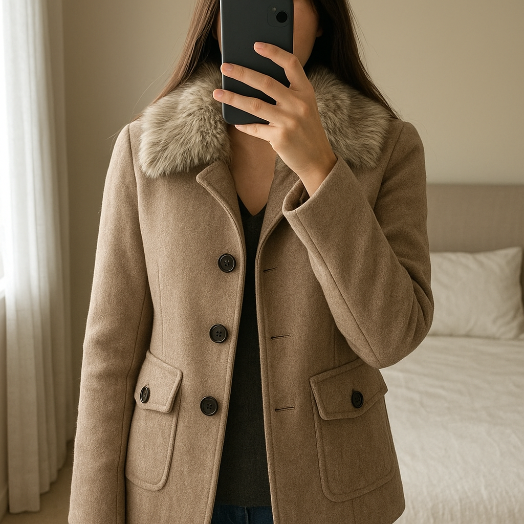 Sobretudo da Cortefiel em pé, de frente para a câmera, em um quarto com iluminação suave e luz natural filtrando pela janela.