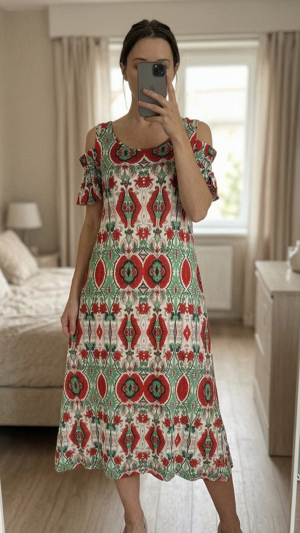 Summer dress Marella debout, face à la caméra, dans une chambre à la lumière douce, avec une lumière naturelle filtrant par la fenêtre.
