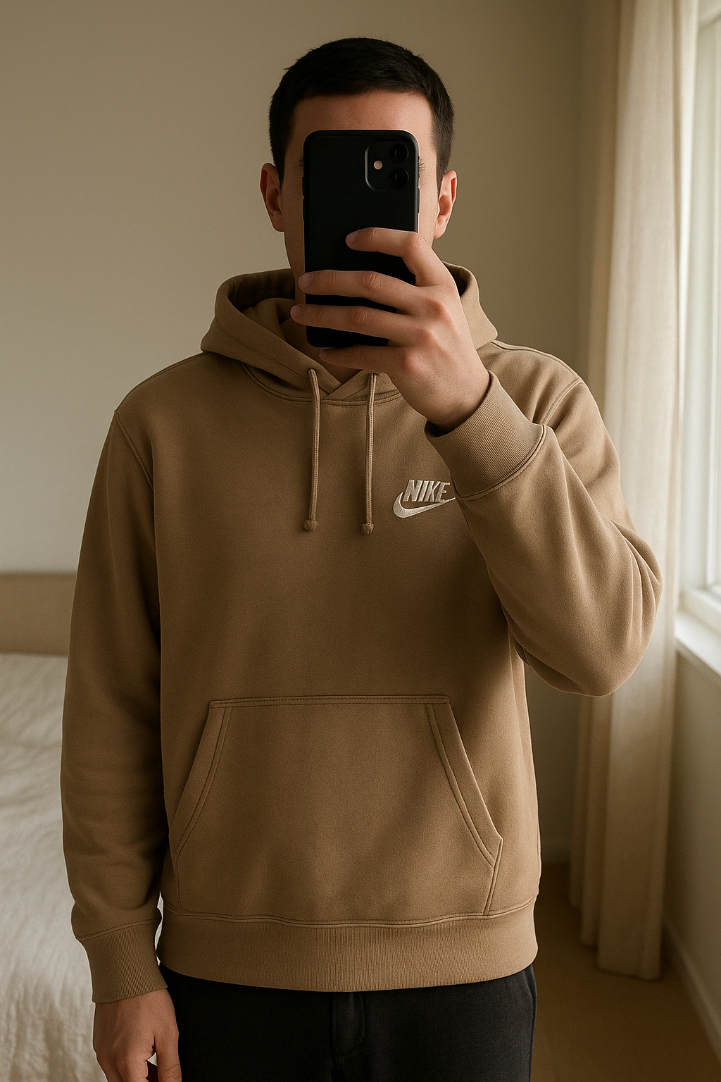 Sweat à capuche Nike debout, face à la caméra, dans une chambre à la lumière douce, avec une lumière naturelle filtrant par la fenêtre.