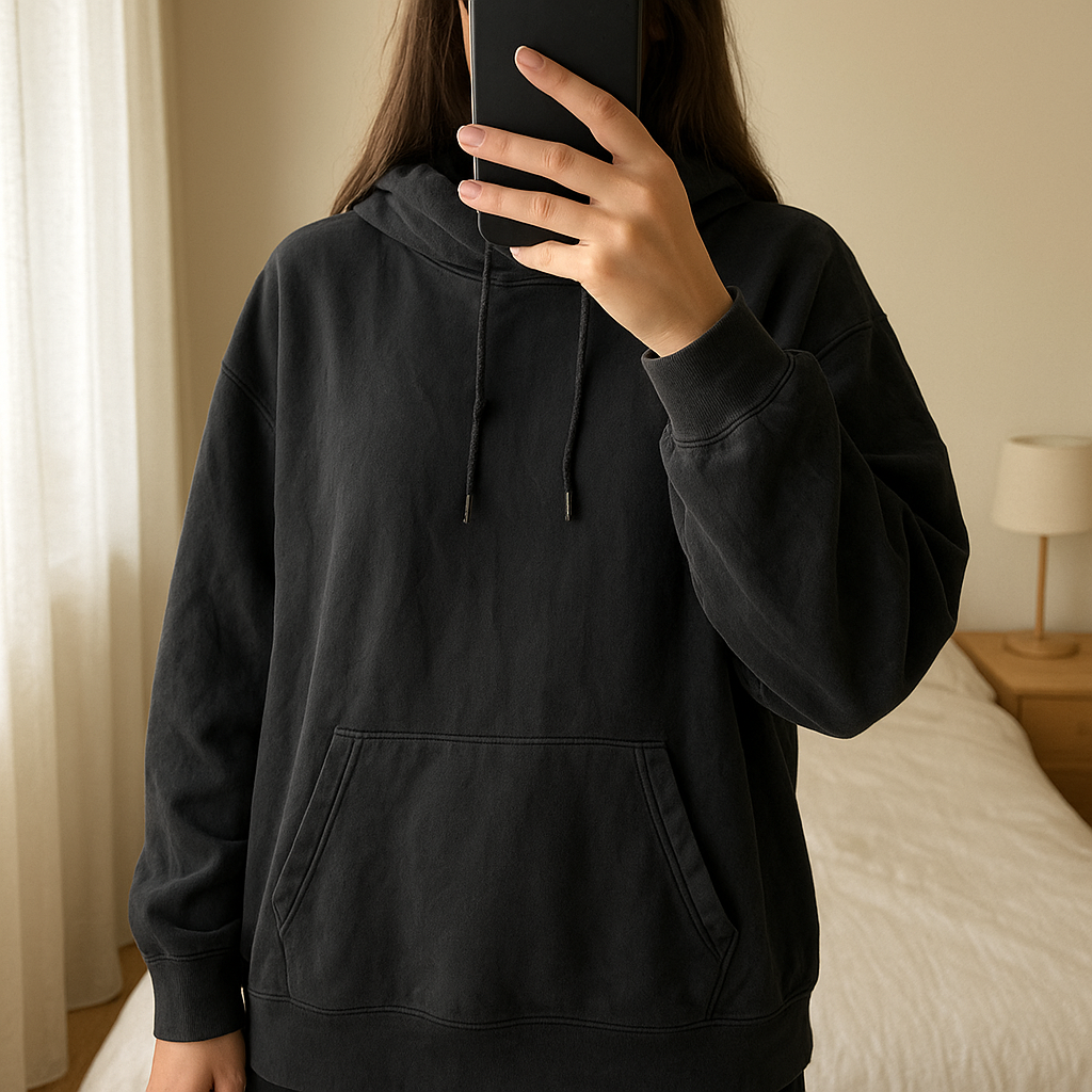 Sweat à capuche Zara taille L debout, face à la caméra, dans une chambre à la lumière douce, avec une lumière naturelle filtrant par la fenêtre.