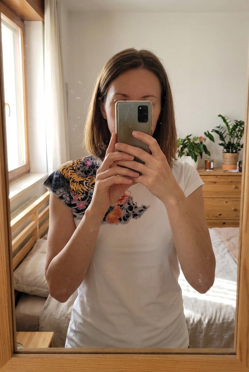 T shirt tattoo Tigre taille S debout, face à la caméra, dans une chambre à la lumière douce, avec une lumière naturelle filtrant par la fenêtre.