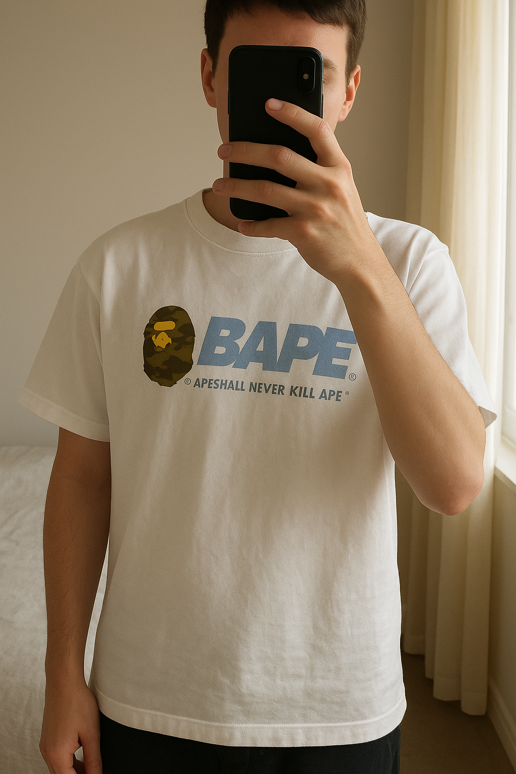 Tee shirt Bape blanc neuf sans étiquette debout, face à la caméra, dans une chambre à la lumière douce, avec une lumière naturelle filtrant par la fenêtre.