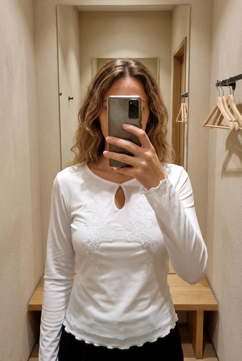 Une personne en Top blouse brodée debout, face à la caméra, dans une cabine d’essayage de style boutique avec un miroir et une décoration neutre.