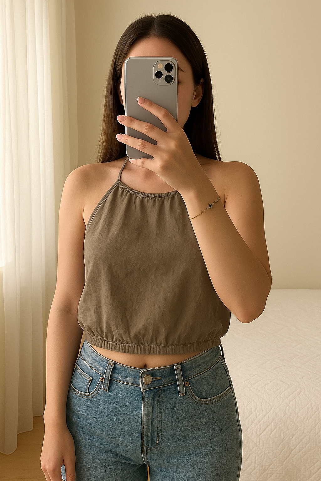 Top court dos nu à encolure américaine - Zara taille M debout, face à la caméra, dans une chambre à la lumière douce, avec une lumière naturelle filtrant par la fenêtre.