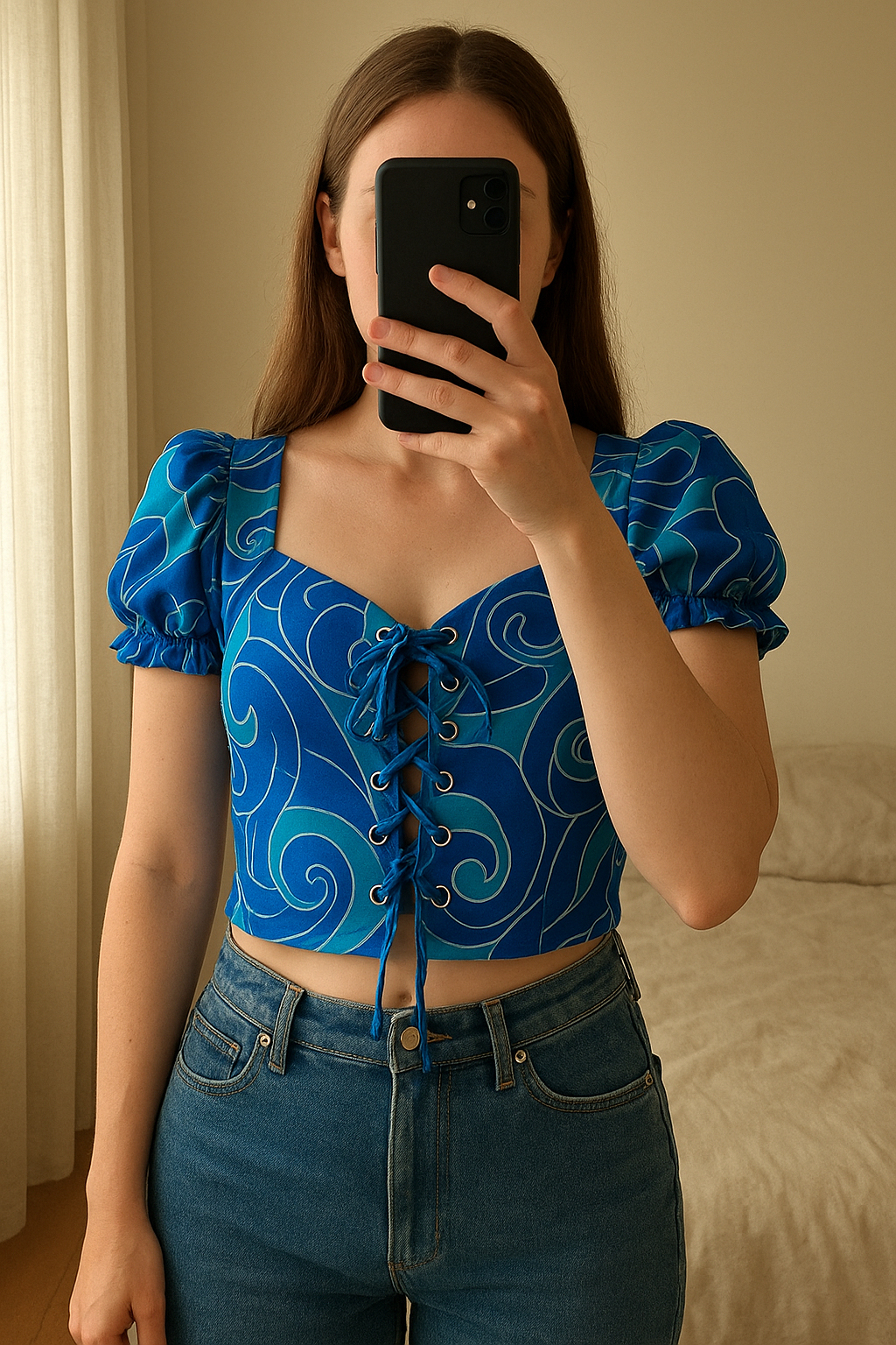 Com um clique, a nossa IA transforma a sua imagem de produto em uma foto realista com modelo.