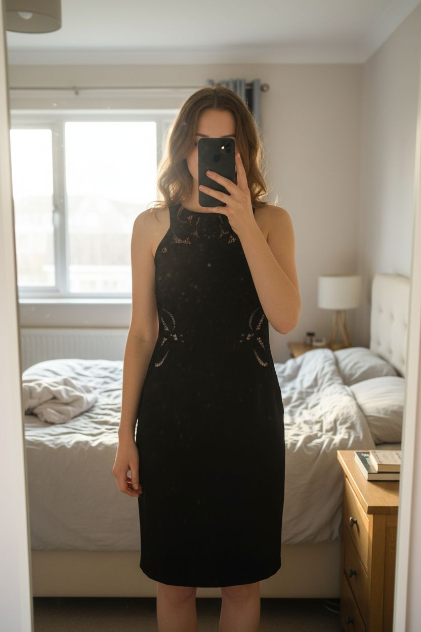 Très belle Robe noire et beige ajustée dentelle Karen Millen em pé, de frente para a câmera, em um quarto com iluminação suave e luz natural filtrando pela janela.