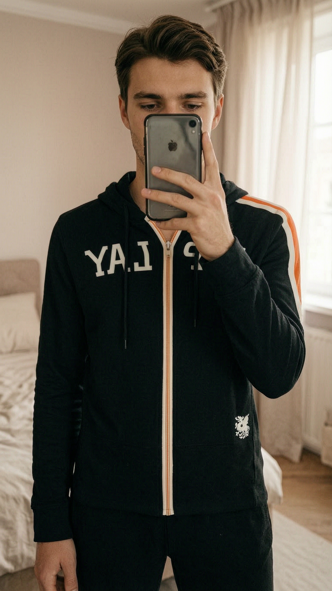 Vente sportwear REPLAY debout, face à la caméra, dans une chambre à la lumière douce, avec une lumière naturelle filtrant par la fenêtre.