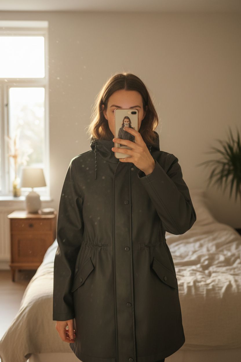 Veste blouson imperméable en cuir debout, face à la caméra, dans une chambre à la lumière douce, avec une lumière naturelle filtrant par la fenêtre.