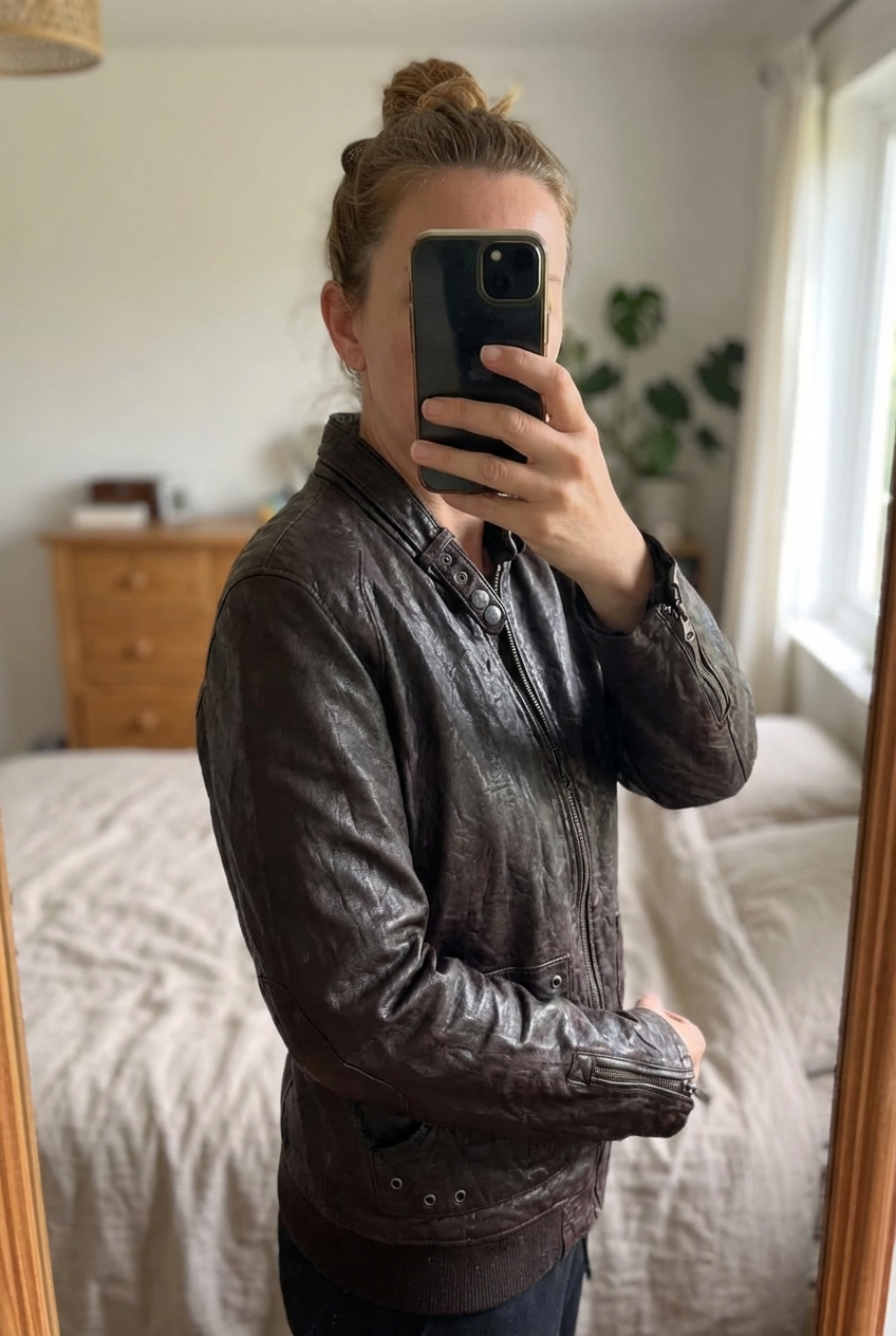 Veste cuir le temps des cerises 42 debout, face à la caméra, dans une chambre à la lumière douce, avec une lumière naturelle filtrant par la fenêtre.