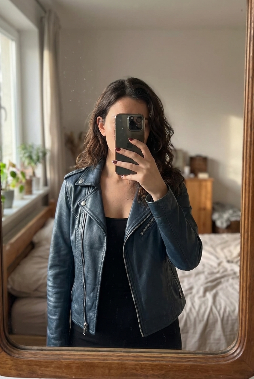 Une personne en Veste en cuir bleu debout, face à la caméra, dans une chambre à la lumière douce, avec une lumière naturelle filtrant par la fenêtre.