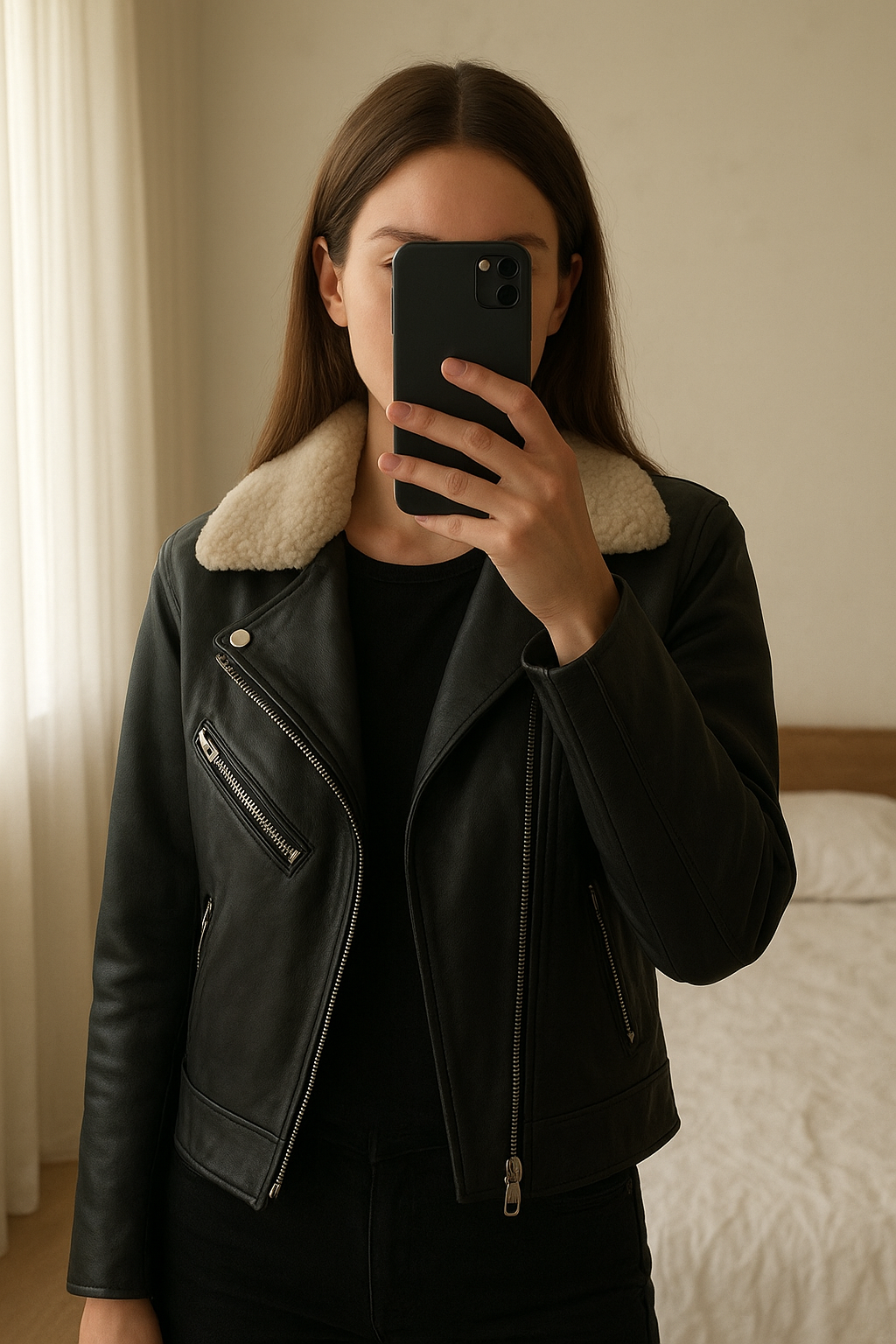Veste en cuir véritable et peau lainée de mouton Sandro noire et beige taille 2 debout, face à la caméra, dans une chambre à la lumière douce, avec une lumière naturelle filtrant par la fenêtre.