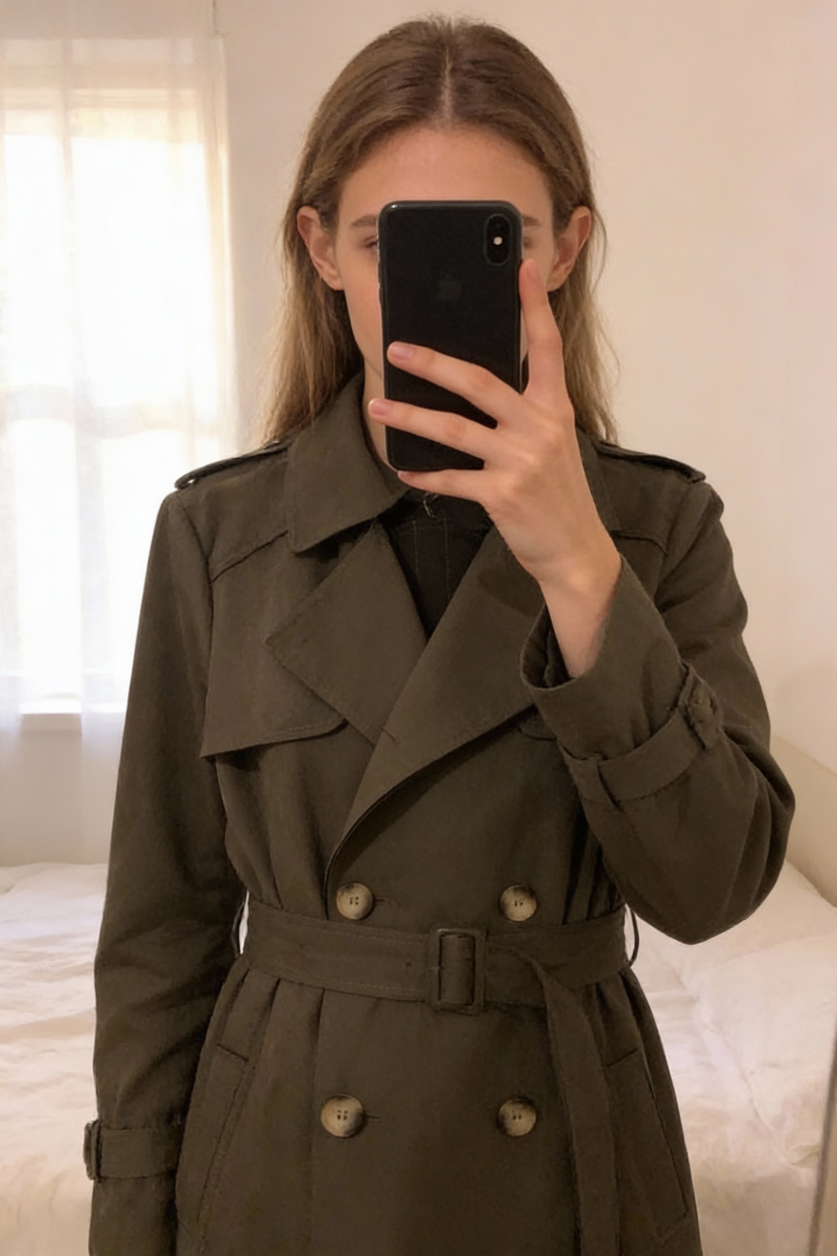 Veste en daim cache cache debout, face à la caméra, dans une chambre à la lumière douce, avec une lumière naturelle filtrant par la fenêtre.