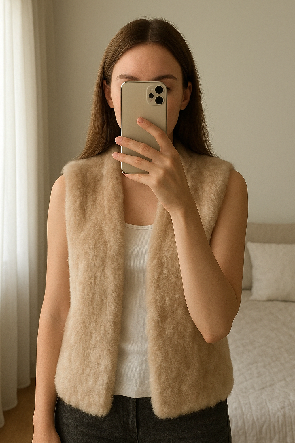 Veste fausse fourrure debout, face à la caméra, dans une chambre à la lumière douce, avec une lumière naturelle filtrant par la fenêtre.