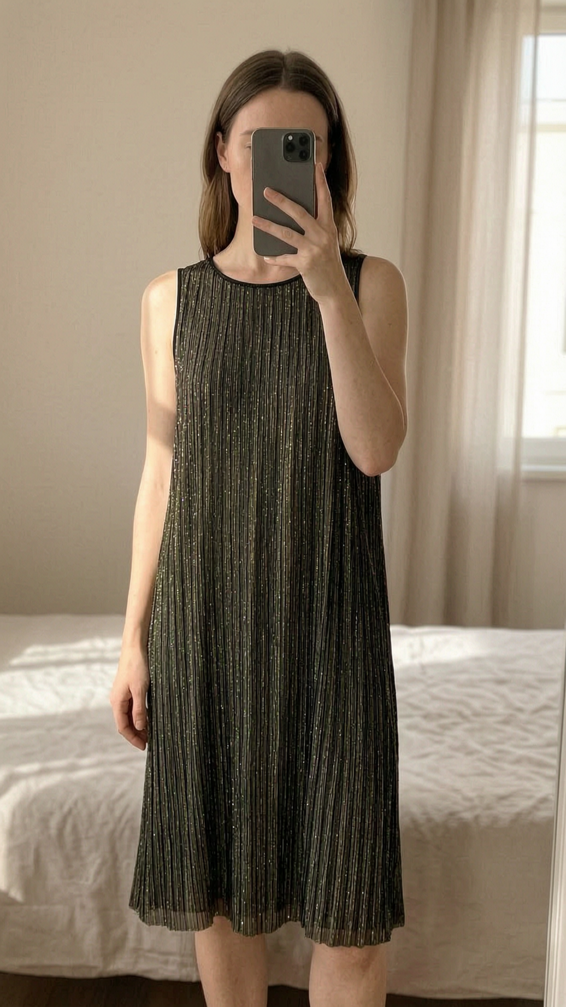 Vestido brilhante Mango em pé, de frente para a câmera, em um quarto com iluminação suave e luz natural filtrando pela janela.