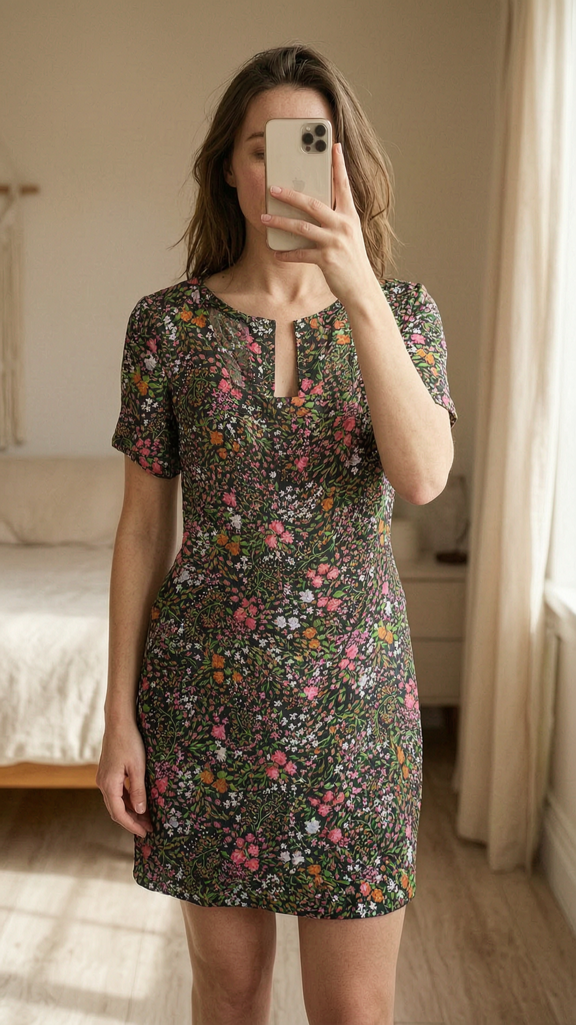 Vestido florido em pé, de frente para a câmera, em um quarto com iluminação suave e luz natural filtrando pela janela.