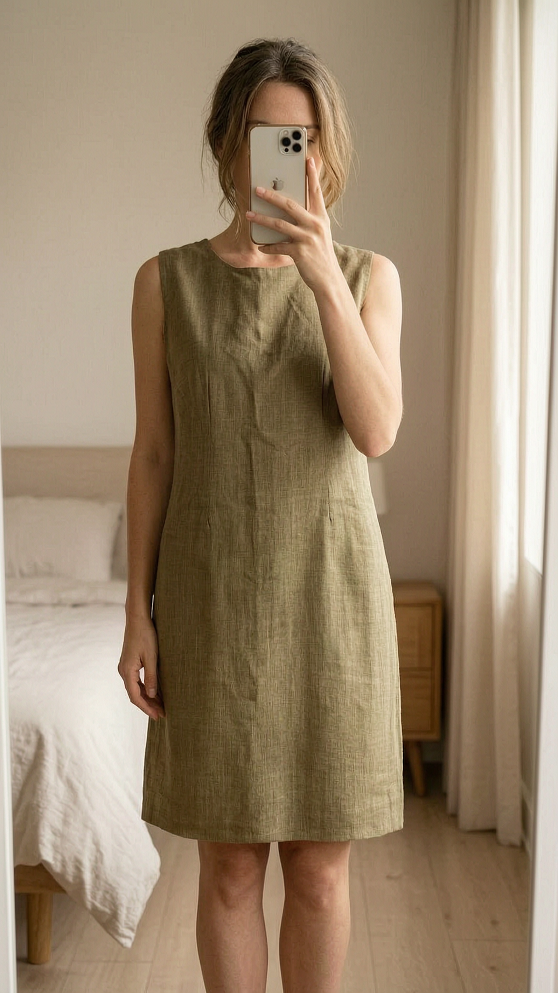 Vestido khaki em pé, de frente para a câmera, em um quarto com iluminação suave e luz natural filtrando pela janela.