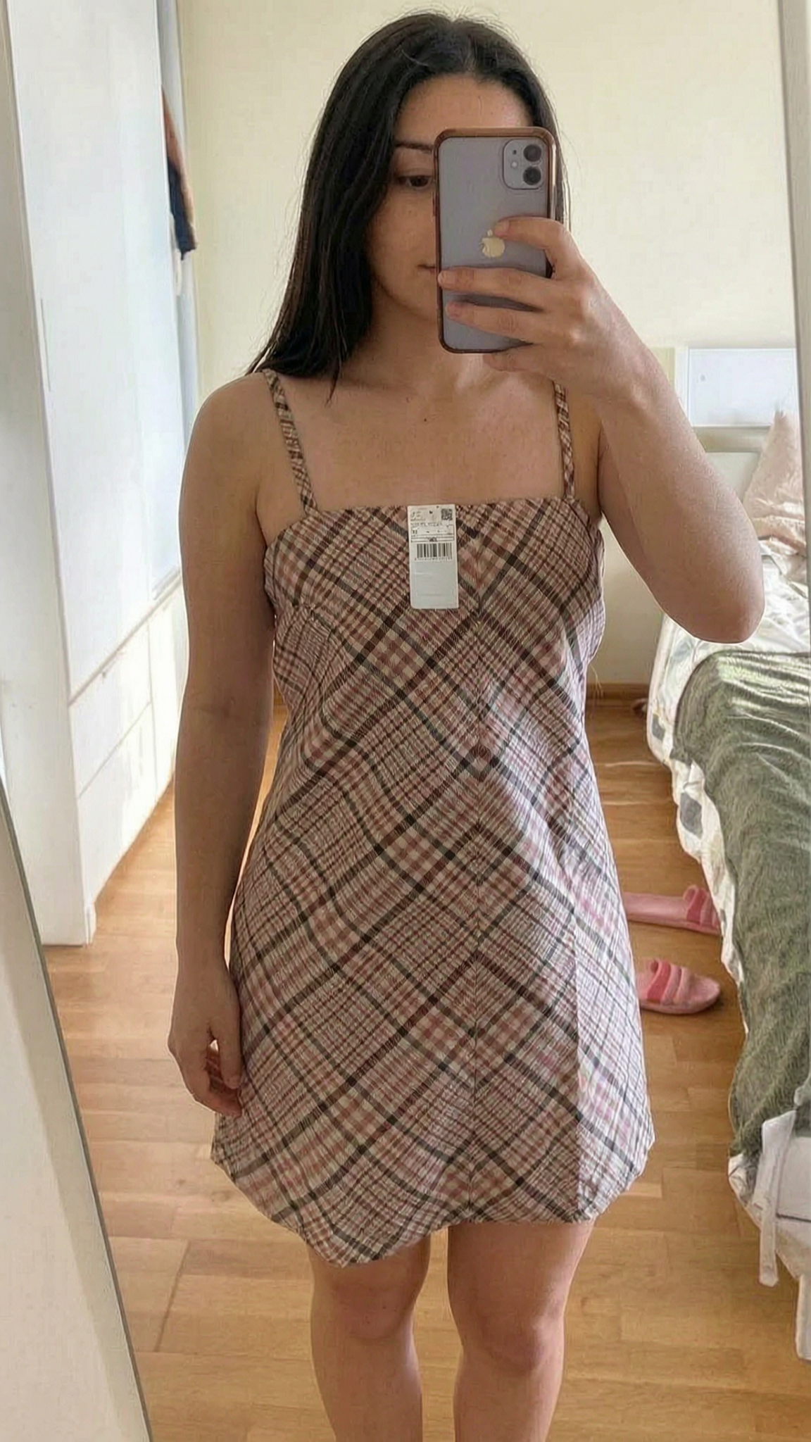 Vestido quadrados escoceses c/etiqueta em pé, de frente para a câmera, em um quarto com iluminação suave e luz natural filtrando pela janela.